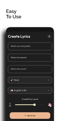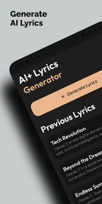 Introducing our AI Lyrics Generator, the ultimate tool for musicians, songwriters, and anyone with a passion for music. Our state-of-the-art AI technology empowers you to generate lyrics for any genre with the touch of a button. Whether you're working on a ballad, rock anthem, or rap verse, our app is designed to ignite your creativity and streamline the songwriting process.