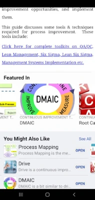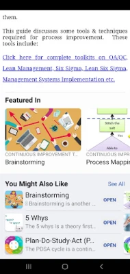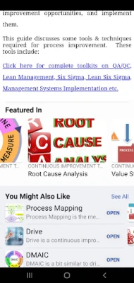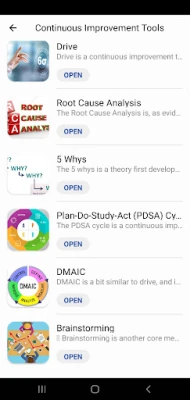 The content of the app has been presented informatively and very simple enough for anyone irrespective of the level of industrial exposure to understand. It covers key continuous improvement terms such as the DMAIC, root cause analysis (RCA) tools (fishbone diagram, 5 Whys Analysis etc.) and others.