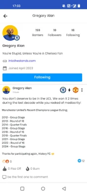 Share memes, videos, and texts, targeting clubs like Arsenal FC or Liverpool FC, and revel in the reactions you receive.