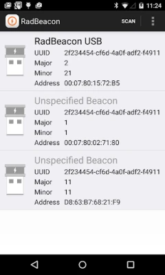 Scan for nearby configurable RadBeacons by pressing the SCAN button. Each beacon discovered is displayed with the following summary details